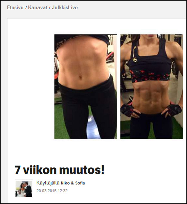 Fitneksestä olisi kiva kuulla ihmiseltä jolla on kokemusta. Mielestäni se kuulostaa jotenkin vaaralliselta lajilta.Syödään toki terveellisesti, mutta kurinalaisesti. Mutta rasvojen karistaminen ja lihasten treenaus näkyviin seitsemässä viikossa kuulostaa mielestäni liian lyhyeltä ajalta eikä voi olla kropalle terveellistä. Samoin itsensä lavakuntoon vetäminen puolessa vuodessa. Tässä yksi esimerkki, kuvien välissä tosiaan siis 7 viikkoa!! sofia_kroppa_muutos